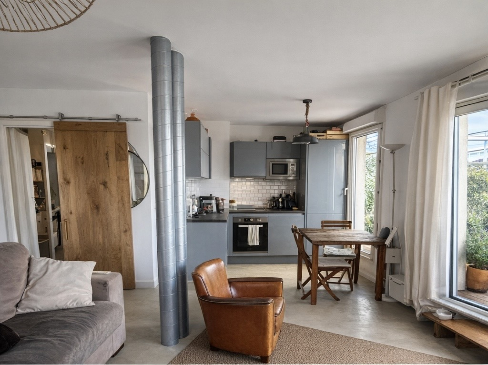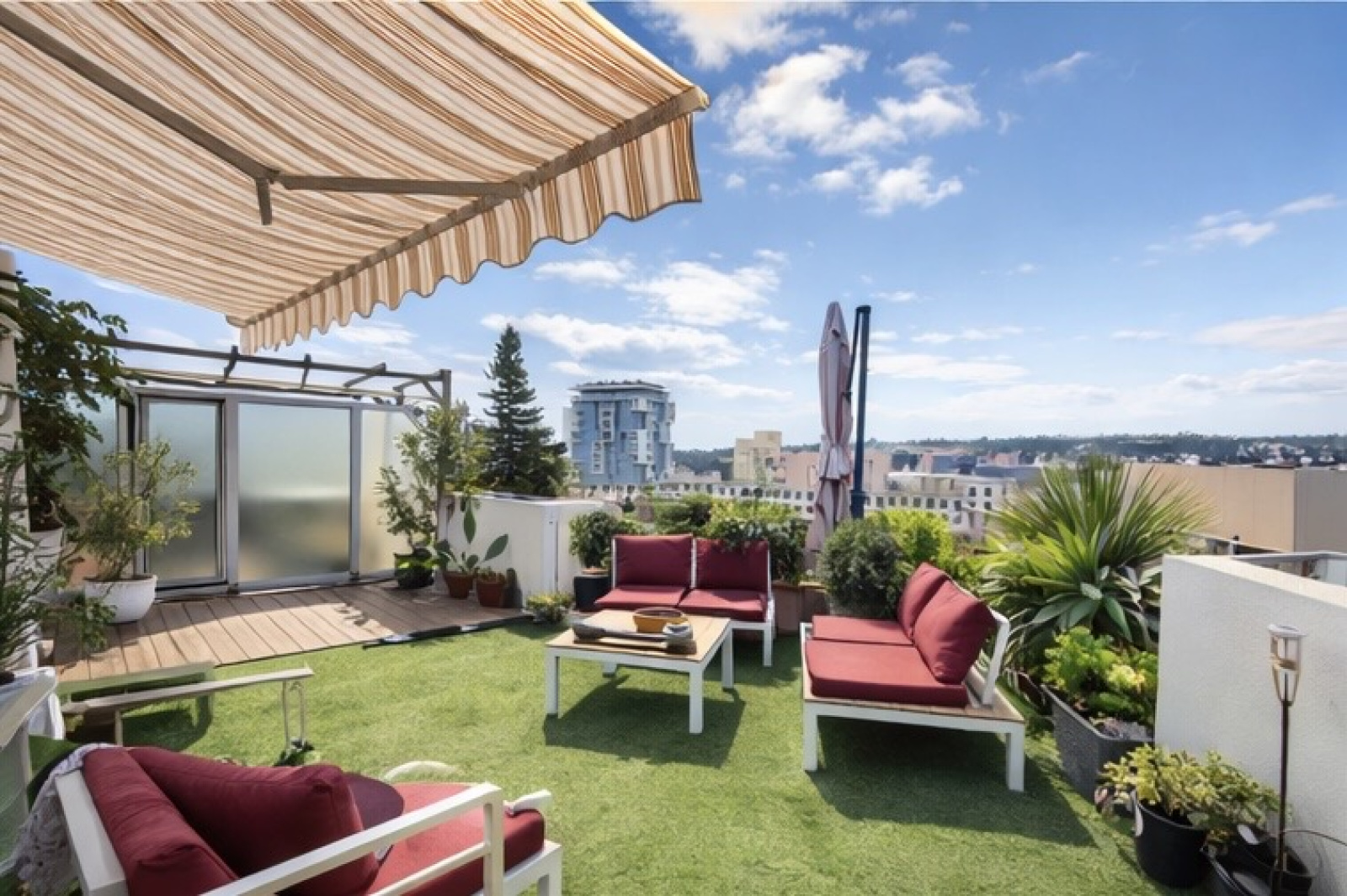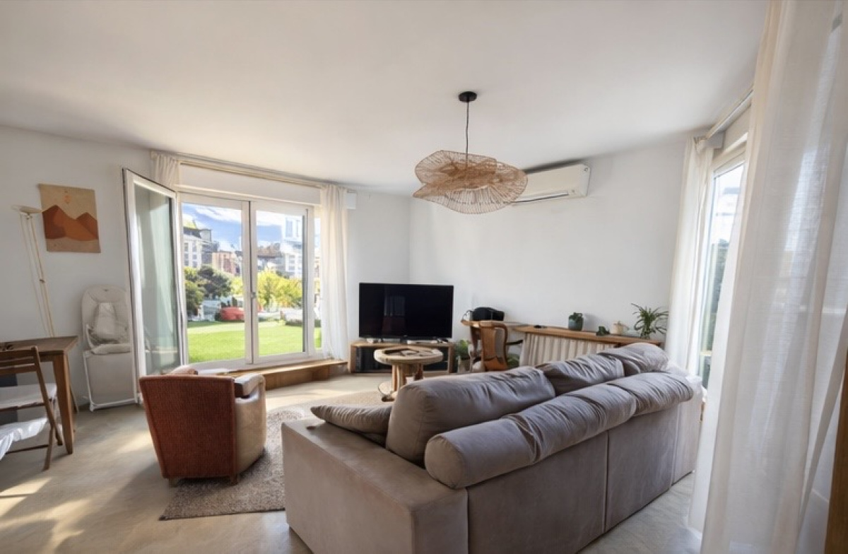 Superbe pièce de vie transformée en un T2 ouvert sur une grande terrasse privative aménagée avec salon extérieur, végétation et jacuzzi intégré.